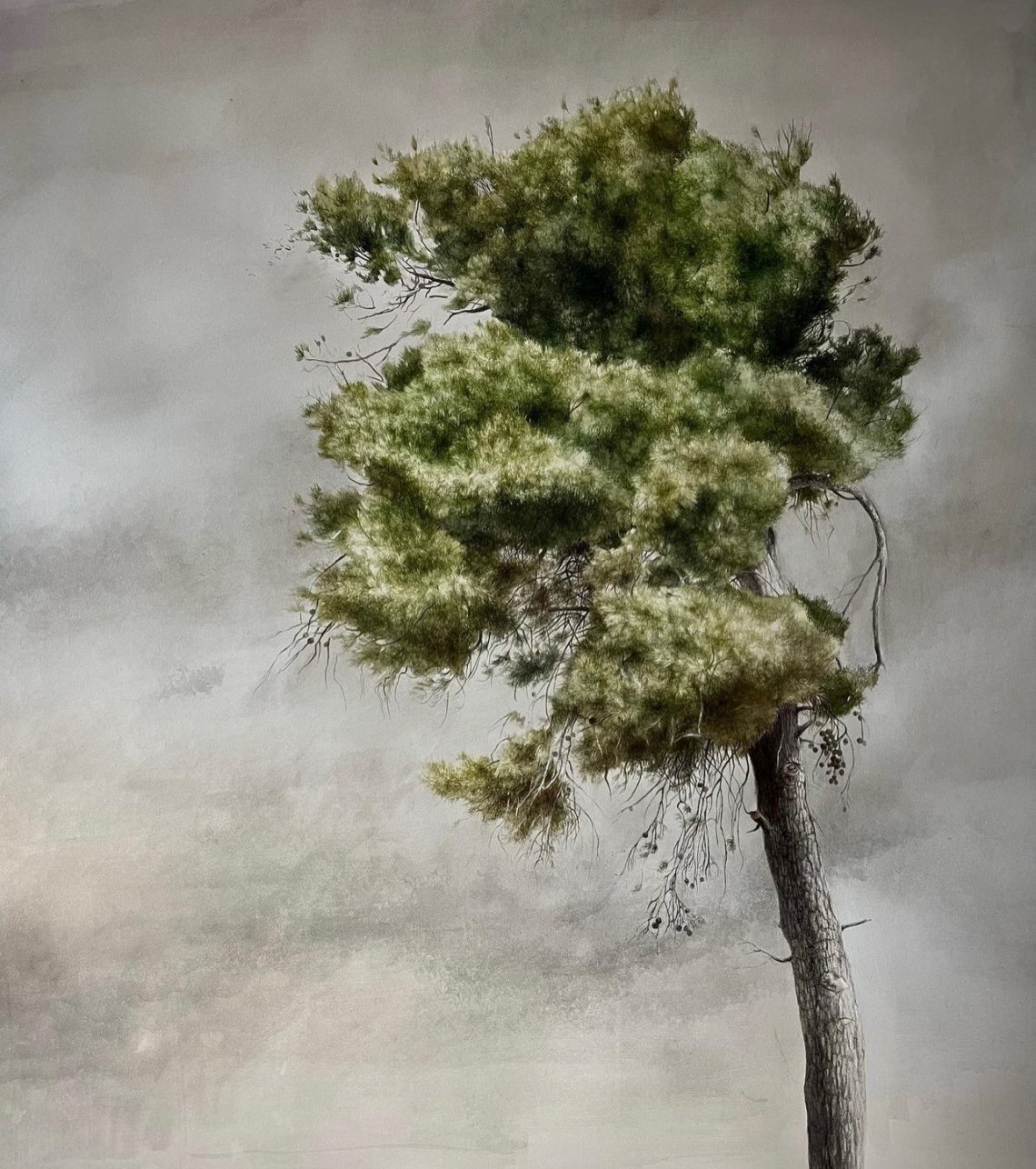 in questa serie cielo e terra si uniscono mediante l’azione del vento; nell'opera la chioma piegata leggermene da un lato è composta da piccoli segni intermittenti e liquidi, mentre la corteccia, quasi un muscolo è trattata con più pigmento che rende la texture più solida.