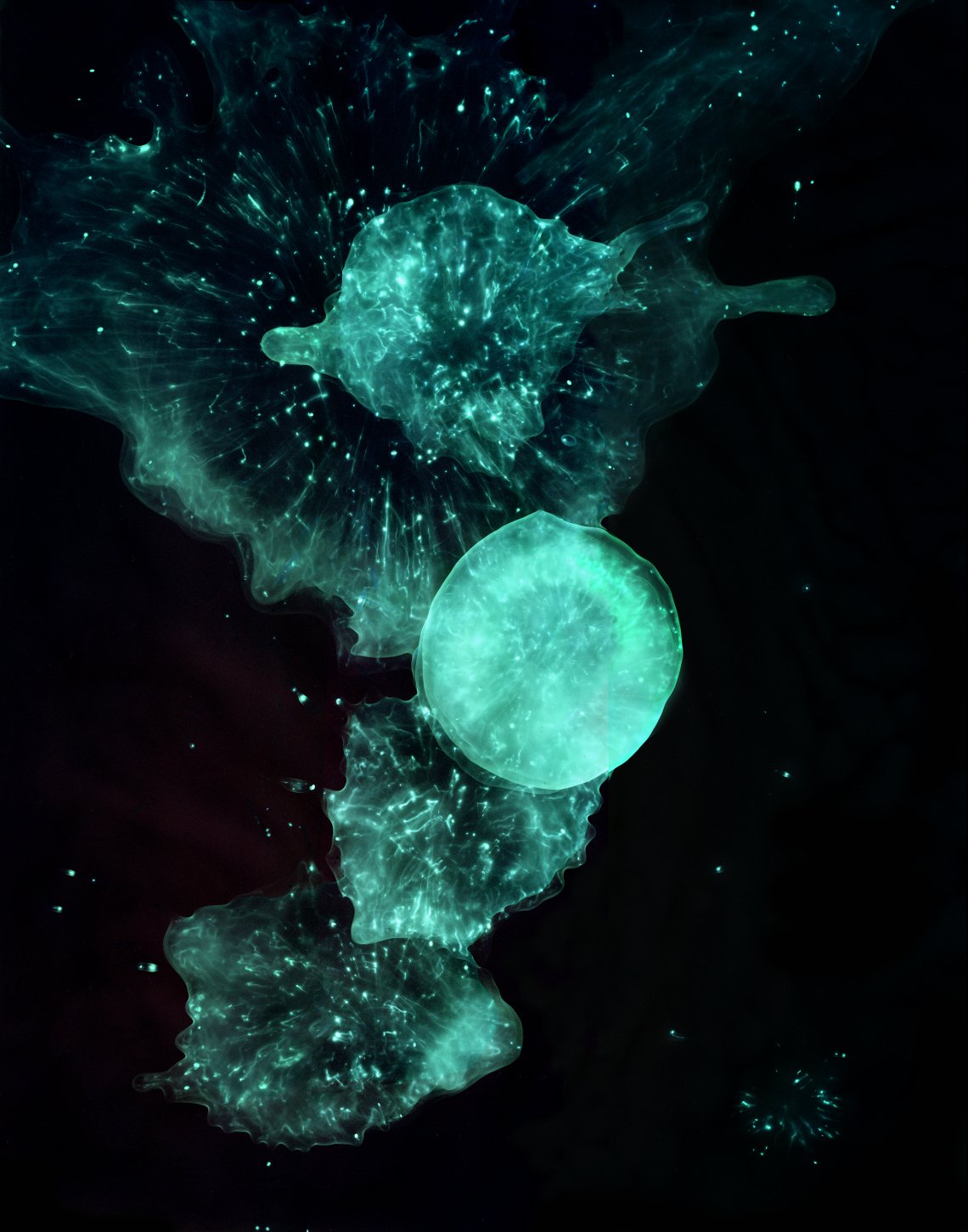 FRAGILE WARNING LIGHTS est une recherche en photographie sur les spécificités du phytoplancton doté de bioluminescence (notamment les Dinophytes. La bioluminescence est l’émission de lumière par des organismes vivants suite à une réaction chimique qui convertit l’énergie chimique en lumière visible. L’émission de ces flashs lumineux est due à une sorte d’accès de stress, généralement lié au remous des vagues. En posant du plancton bioluminescent sur un plan film, celui-ci est exposé uniquement par l’émission de lumière du plancton. L’instantané des flashs de lumineux et l’agitation du plancton, sont ainsi fixés dans une image, qui - en enregistrant le mouvement - capte les dégradés et crée visuellement une profondeur. Normalement, le photogramme est une pièce unique quand il est réalisé avec du papier. Pour FRAGILE WARNING LIGHTS, j’aimerais expérimenter avec des plans films, ce qui permet d’agrandir les images. À travers cet agrandissement, l’excessivement petit du plancton, nous permet une lecture autre: les images se rattachent a l’infiniment grand et soulignent l’importance de ces microorganismes. Beaucoup de facteurs qui permettent ou empêchent notre existence sont visibles au microscope, mais invisibles à l’oeil nu. Le fait que la lumière vient de l’objet et non d’une source extérieure nous montre le photogramme (avec une surface pellicule) le plus radical que possible. C’est la photographie dans sa forme la plus pure qui documente un événement dans un temps précis.