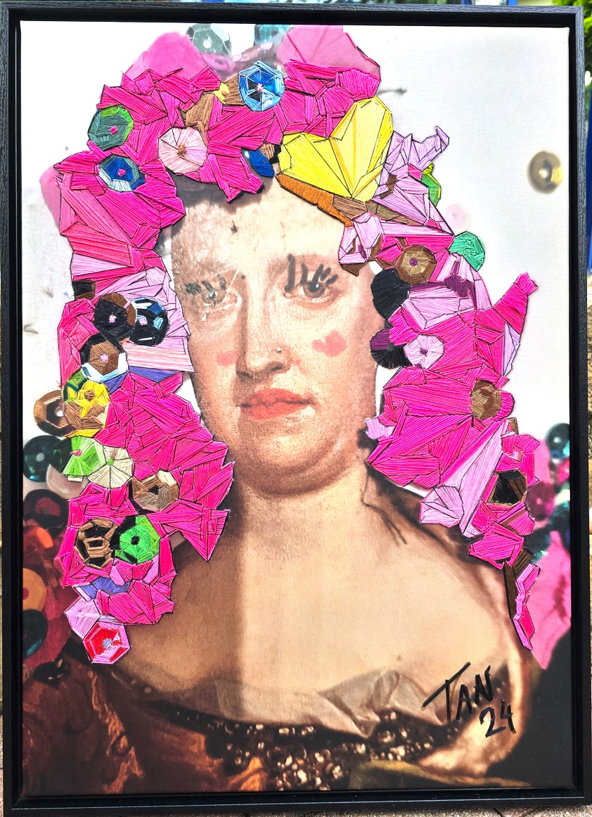 In this piece, the portrait of Maria Theresa is enhanced with the integration of embroidery and painterly elements, weaving together modern and historical aspects. The embroidery represents the many facets and identities that exist beyond the binary gender spectrum, while the painterly accents illustrate the fluid and diverse ways in which people experience and express their gender identity.