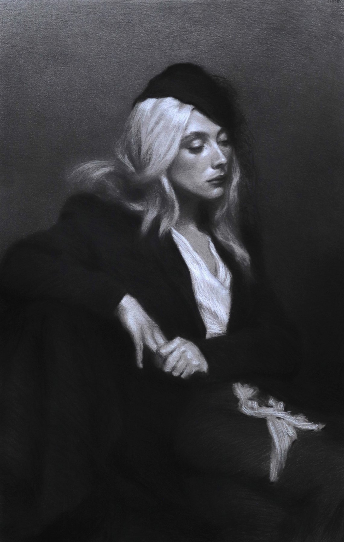 L 'opera presentata, è stata realizzata interamente dal vero con carboncino e gessetto bianco su carta Arches tonata a mano dall’artista.