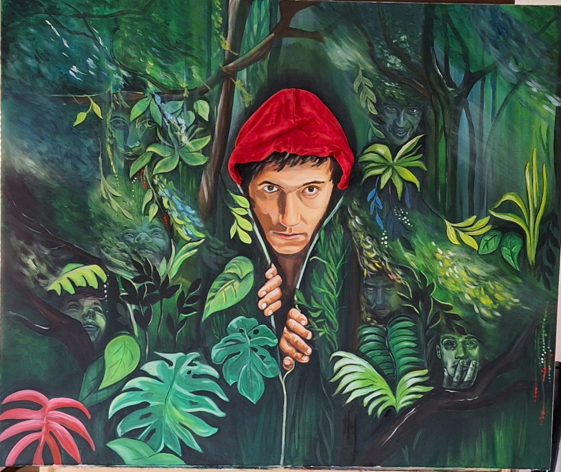 Dieses Bild ist eine Kombination aus Ayrylfarbe und Textil auf Leinwand. Zwerg 7 zeigt sich, aber wo sind die restlichen 6 Zwerge? Man darf gespannt sein.