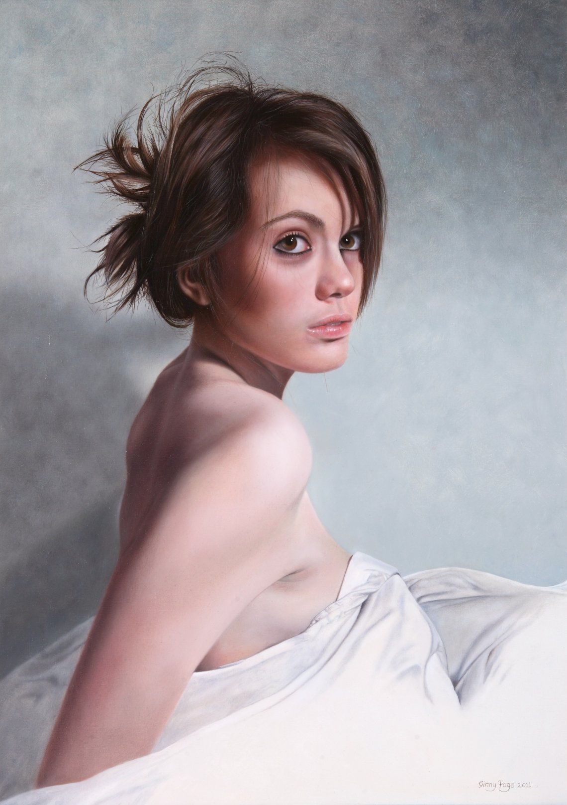 An oil painting of my sons girlfriend who I caught her by surprise one morning by coming in with a cup of tea! She covered herself quickly with the sheet and was very coy!