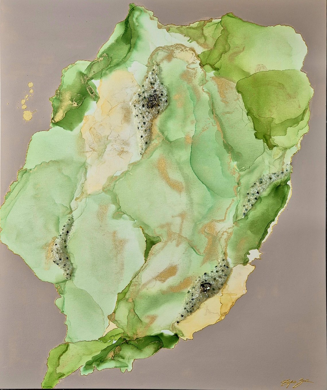 Alcoholink mit Acrylfarbe, Blattmetall, echtem Pyrit auf Bergkristall mit Smaragdsplittern. Inspiration für dieses Kunstwerk ist die Natur, mit all ihrer Schönheit und dessen verborgenen Schätze.
