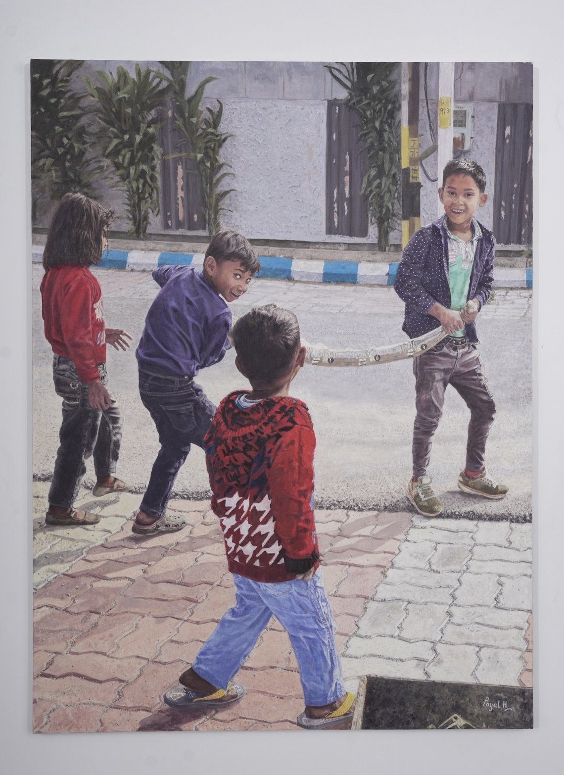 I was returning from my morning run, when I saw some young kids playing by the kerb. They had filled a piece of garden hose with some dirt and were slinging it around. What ensued was unrestrained mirth and a whole lot of fun. I was struck by the innocence and simplicity of these kids. The scene kindled many childhood memories and thus I decided to create this painting in oils. The work can be described as detailed with a focus on composition, feel, and color harmony. Elements such as the grey backdrop and a hint of sunlight on a cold winter day are balanced by warm countenances and vibrant colors in the foreground.