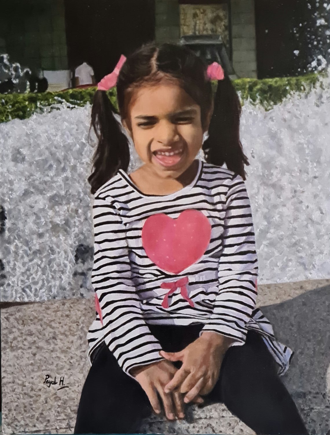Sitting in front of a sprightly fountain, my little one is thrilled as a myriad of tiny drops fall on her neck and brow. This is a special memory of our first international trip with our daughter. It was also her favorite character, Mickey’s birthday. Truly, there was ‘Joy’ in the air. While doing this painting, I took inspiration from the works of Frans Hals. I am a huge fan of warm and cheerful quality evident in his portraits.