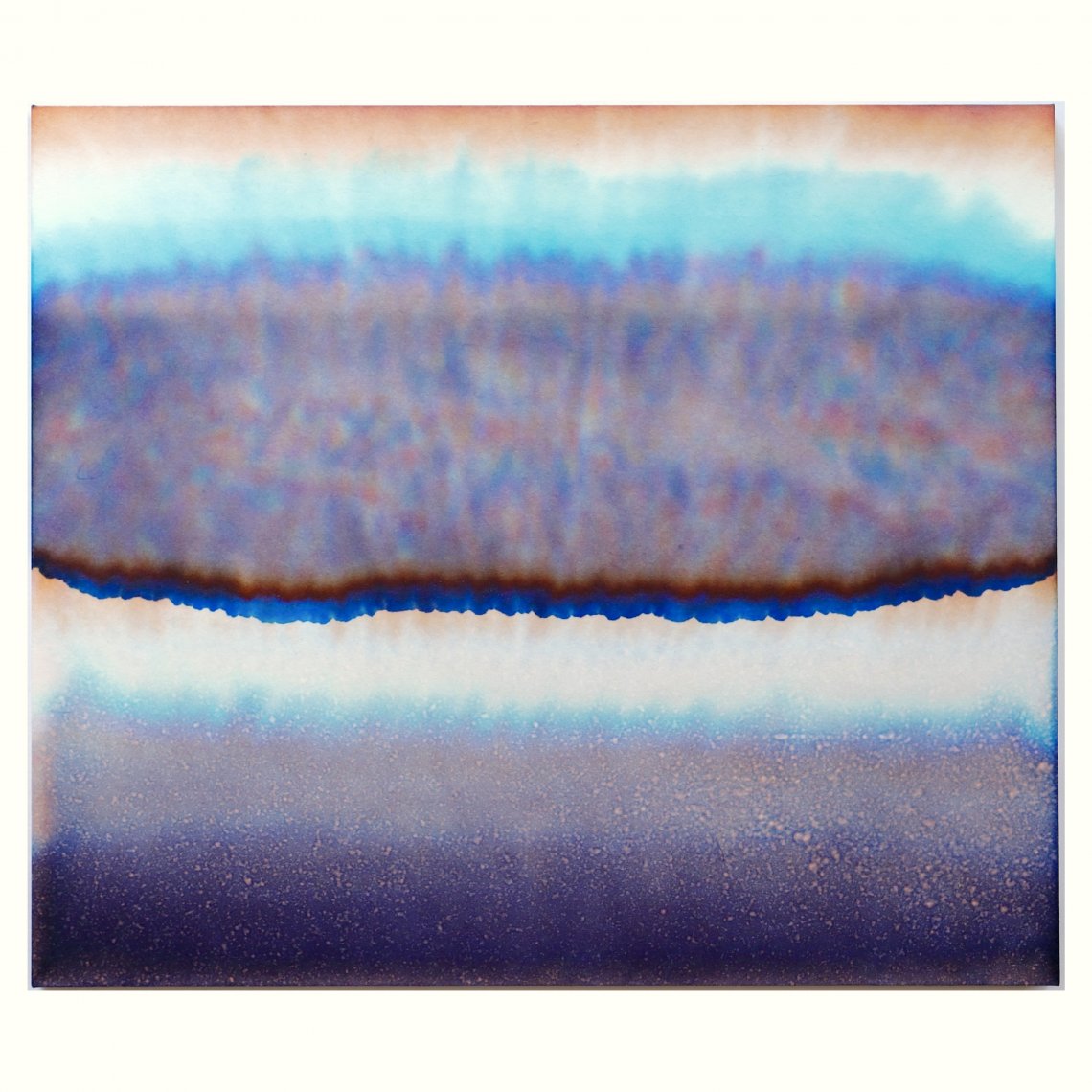 Inspiration for her painting comes from her high curiosity about art material. For her paintings, she uses her original material that reproduces Japanese traditional Sumi ink using a chemical reaction like photosynthesis and oxidation. As a result, the "Black" ink shows blue, orange, purple and other colours at the same time. The outcome varies depending on how she drips ink on the paper, what kind of components the paper has, how much water it contains, how it gets dried and how many layers the painting has. She also uses Japanese traditional paper called Washi which sensitively absorbs the ink, and shows settled and beautiful bleeding. She begins with painting free of any prejudices, and following the mutual interaction between her and the materials, unexpected occurrences suggest to her what comes next. In this way, the material is free from her operation and can show genuine potential in itself. She carefully perceives how dripped ink stains on a piece of paper change its appearance while getting dried: shapes, colours, compositions or pictorial space. Continuing this process allows her to feel that spontaneous painting has something to tell us with a sense of meaning. She also places importance on the logical necessity of the material used. Although she coolly and objectively gives a title to the painting through her daily notions, thoughts and interests in philosophy, she finally completes the expression.