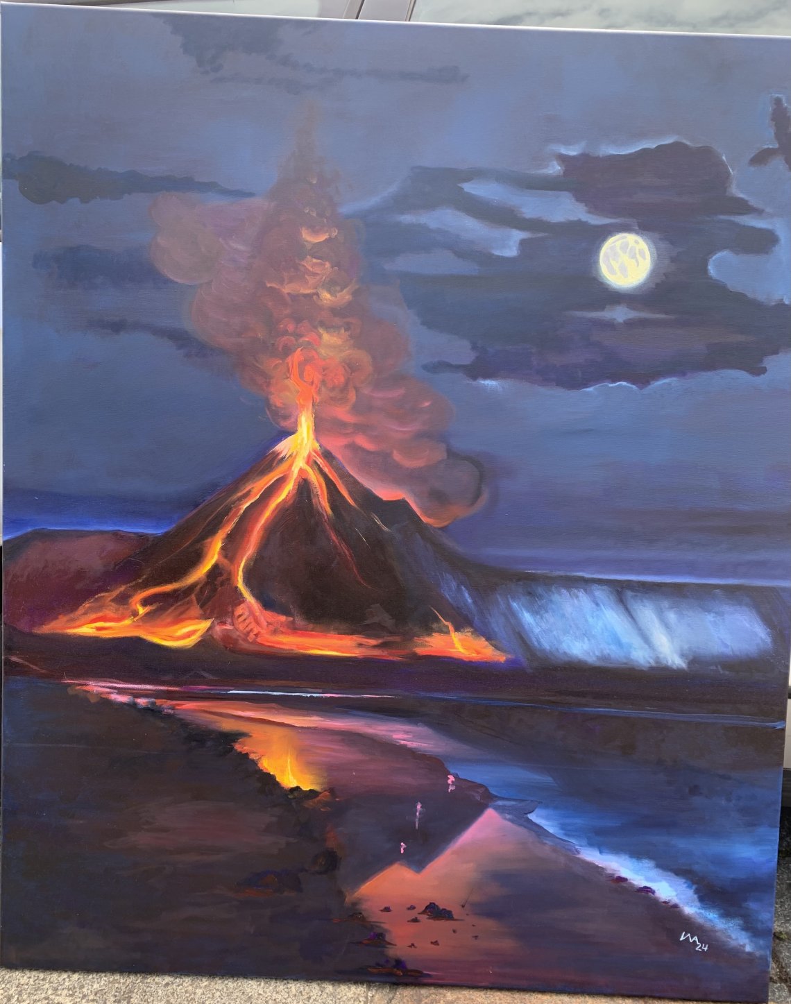 Aus der Spitze des Vulkans steigt eine mutige Lady.