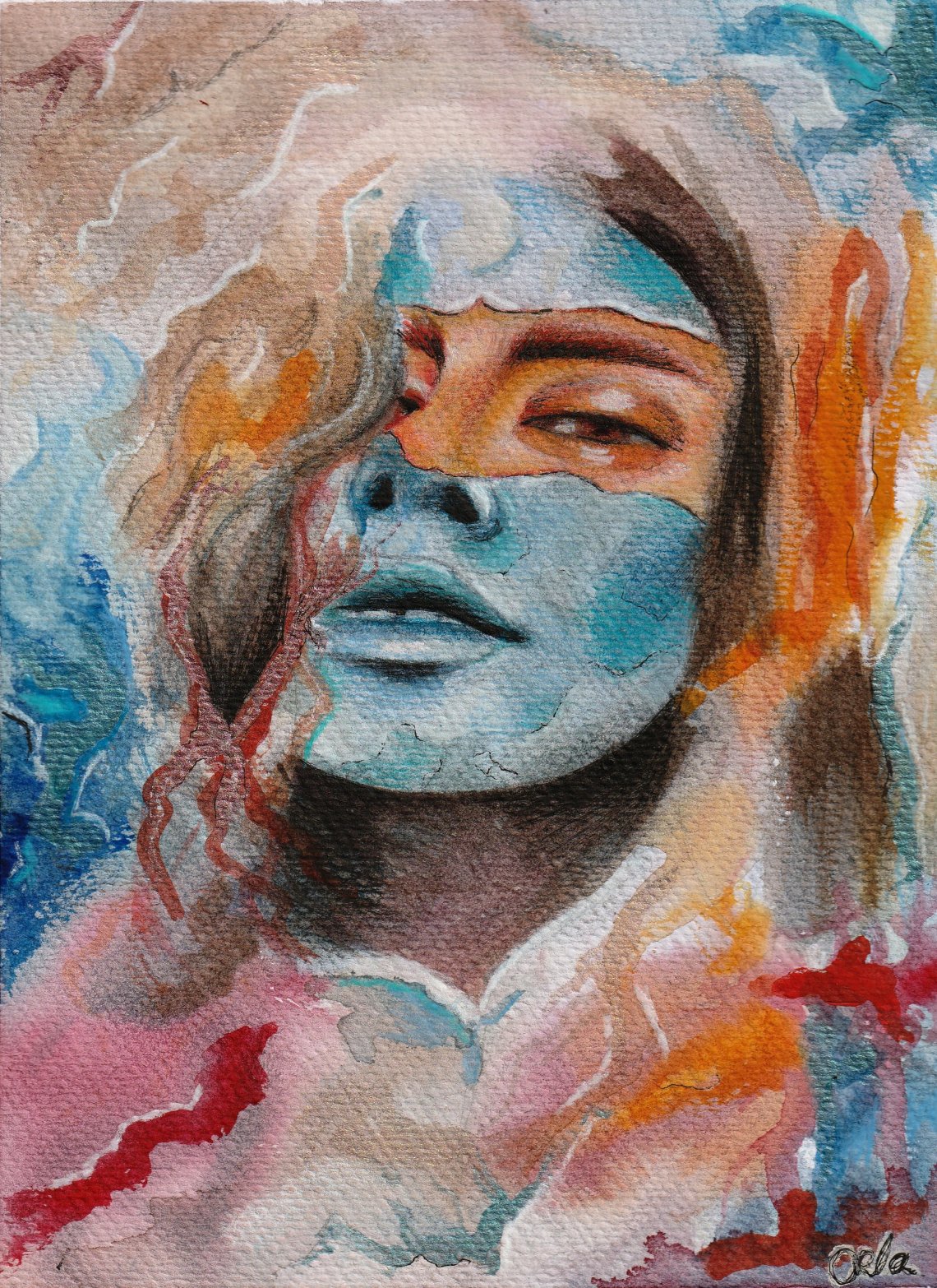 This painting is a watercolour painting and depicts a woman's face surrounded by colours of blue, beige, oranges and reds. It is a reminder that you do not have to live your life the ways others want you to. Your life is your own and you have the courage to live it your way. Let your true self emerge. This painting is made on watercolour paper and displayed in a white 8x10 inch frame.