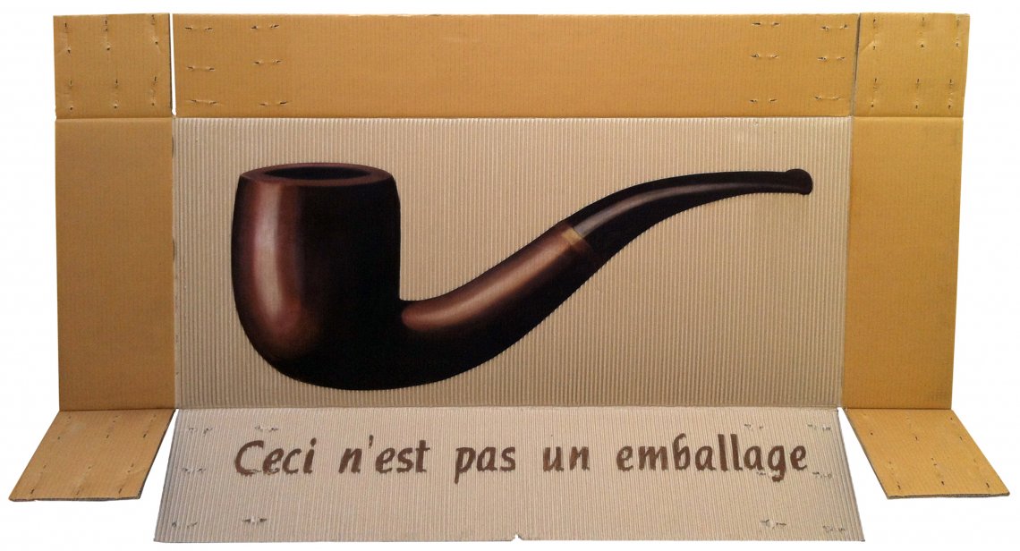 Quando nei primi anni duemila partecipai ad una mostra a Parigi e inviai la mia opera realizzata sulla superficie interna di un imballaggio, un po’ per scherzo ma anche per paura che strappassero il cartone, scrissi sulla superficie esterna “Ceci n'est pas un emballage”, infatti l’opera era un tutt’uno con l’imballaggio, o meglio l’imballaggio diventato opera d’arte. Nel mio lavoro infatti il cartone non è più supporto di un lavoro pittorico ma parte essenziale dell’opera stessa, sia concettualmente che fisicamente, e non ultimo con messaggio ambientalista rivolto al riuso dei materiali. Anni dopo, in una di quelle surfate sull’onda del gioco divertito che a volte è la creazione artistica, ho realizzato quest’opera dedicata a Magritte.