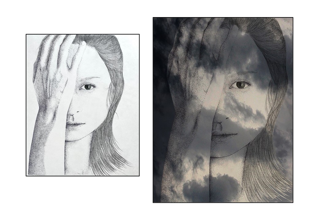 I combine ink drawings (dots, stippling) with digital image elements (pixel). The first step is always a pencil sketch followed by inking. I scan the finished ink drawing and the rest is magic - with a little help from my computer/camera. The final mixed media work is printed by Whitewall. The art lover always receives the mixed media work and the ink drawing.