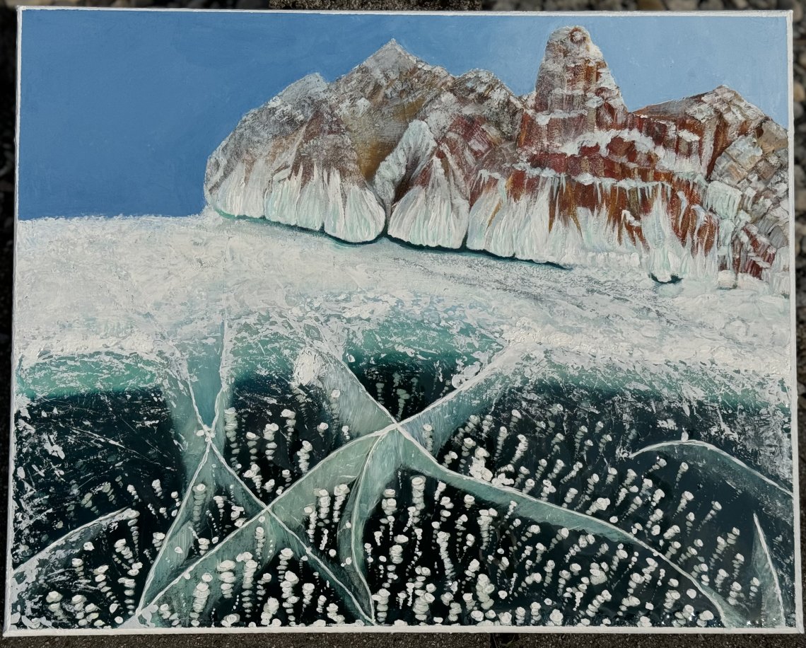 The work is done on canvas with oil and acrylic paints. The lake itself is filled with epoxy resin. Size 40/50