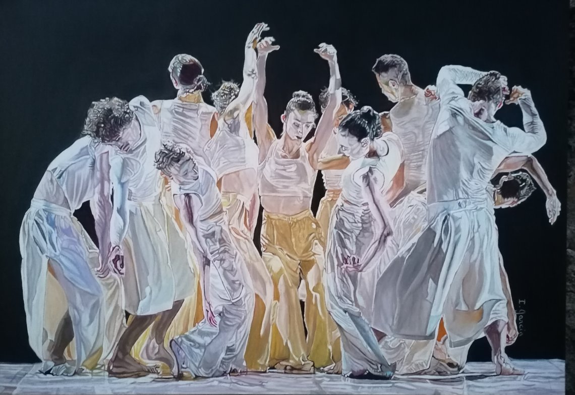 Inspirée du ballet TORPEUR du chorégraphe Angelin Preljocaj et de la photographie de Laurent Philippe de Paris, j'ai travaillé dans ce tableau la transparence des vêtements des danseurs.