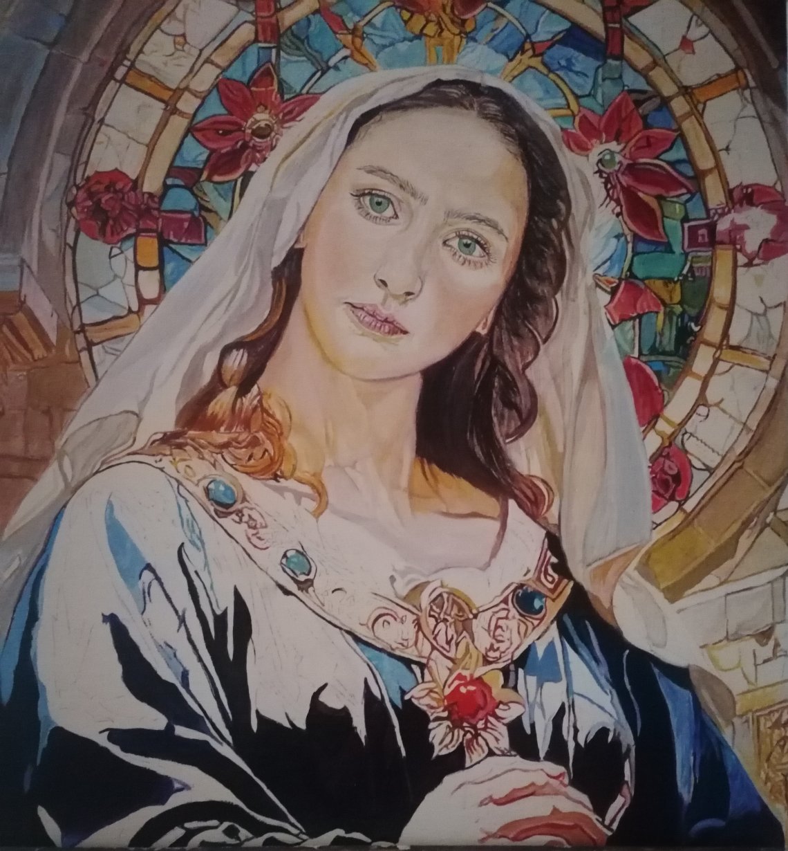 La madone devant des vitraux qui nous envoie sa lumière. Je suis agréablement surprise de la demande en art religieux qui touche un public de tout âge