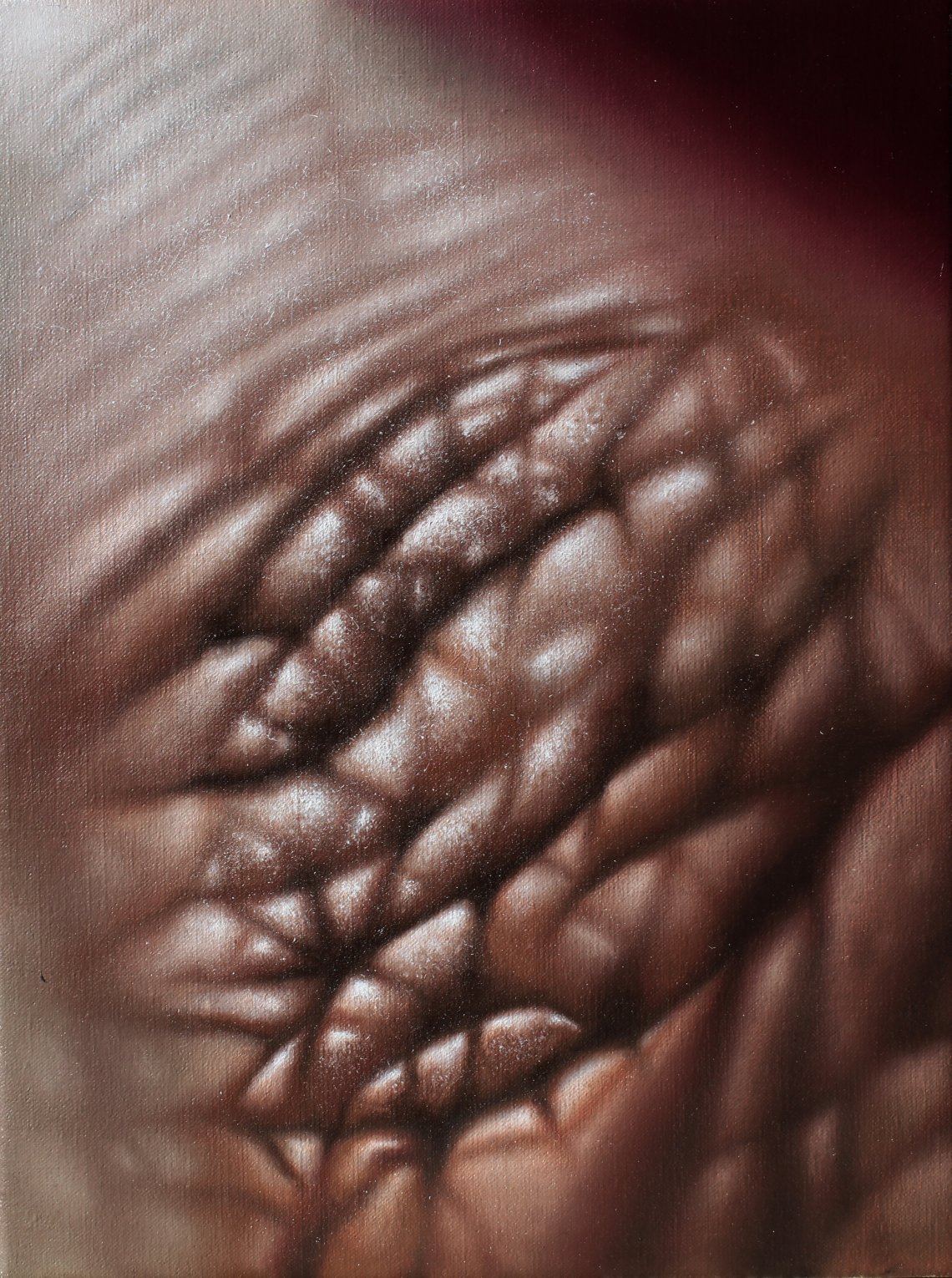 Con questa introduzione di matrice filosofica e letteraria, gli eleganti paralleli tra paesaggio e corpo, la commistione tra elementi antropomorfici e dati geografici e cartografici, ci conducono verso una dimensione che tende all’astrazione seppur partendo da principi fenomenici e reali. In termini più concreti, Super-facies (olio su tela di lino 40 x 30 cm) ha il desiderio di approfondire in modo analitico la geografia dello spazio pittorico, soffermandosi cioè sul dettaglio o sul microcosmo epidermico, diminuendone così tanto le distanze fisiche affinchè esso appaia nel medesimo istante sia elemento riconducibile, tramite la nostra esperienza ottica, ad un qualcosa di familiare, sia soggetto non più riconoscibile in quanto tale. L’obiettivo è quello di allontanarsi dalla dimensione figurativa in senso tradizionale e di avvicinarsi a quella informale, porsi tra naturalismo e astrazione, tra realismo e destrutturazione formale mantenendo l’elemento che si sta analizzando per ciò che è, o meglio, con un semplice pretesto di focalizzazione massima sul particolare, allontanarsi da quello che generalmente viene considerato iperrealismo. La pelle essendo apticamente in contatto con il tempo e assumendo il valore di orologio biologico, ci parla increspandosi e arricchendosi di dettagli, gli anni la plasmano e la trasformano accompagnandola, come detto poc’anzi, verso una dimensione (pittoricamente parlando) astratta. In quanto mappa della memoria o del tempo, ho scelto di dare all’epidermide questo duplice valore. Se da un lato, figurativamente parlando, la pelle con il suo corrugarsi si struttura e si complica prendendo sempre più le sembianze di una mappa o di una cartina, dall’altro lato invece il tempo agisce su di essa privandola di forma e portandola nella dimensione dell’ intangibile.