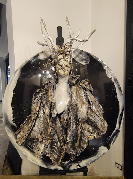 "Radici di libertà" è una scultura che rappresenta un busto umano modellato in resina e plastica, che indossa un vestito realizzato in plastica fusa. La testa è racchiusa all'interno di una gabbia formata da una rete di chiavi disposte in modo da creare una prigione intorno al volto, I rami contorti che fueriescono dalla gabbia, simili a radici, rappresentano un conflitto tra l'immobilità imposta dalla società e la spinta incontenibile verso l'evoluzione personale.