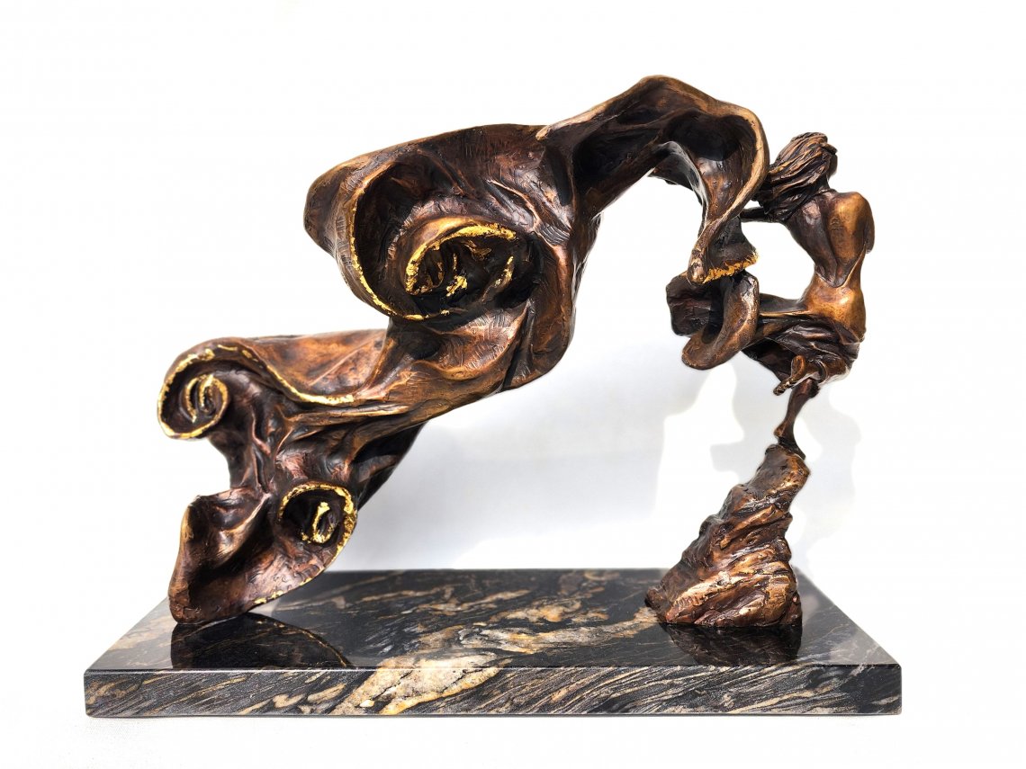 All three sculptures from the ABOUT TIME series feature a very deliberate compositional geometry between the figures’ attention and their billowing outsized capes.  Testé traces each swirling force with goldleaf stressing the dynamic potential of the future, present, and past.  She further connects the series with musical metaphors as titles.