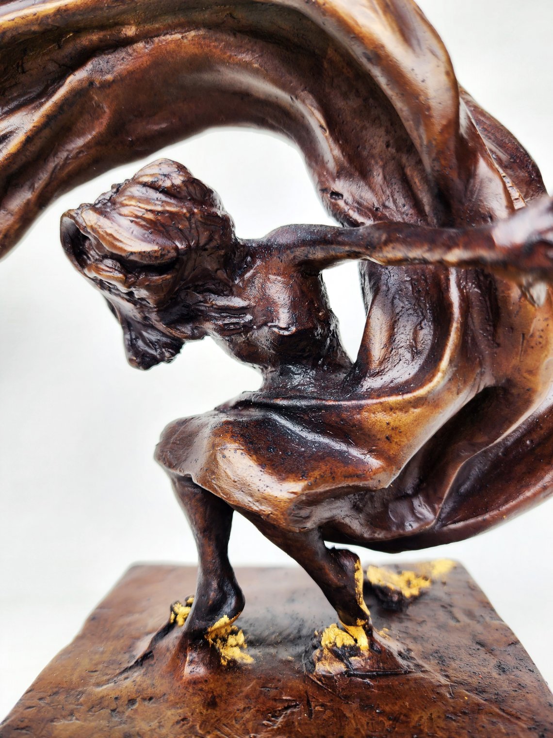 All three sculptures from the ABOUT TIME series feature a very deliberate compositional geometry between the figures’ attention and their billowing outsized capes. Testé traces each swirling force with goldleaf stressing the dynamic potential of the future, present, and past. She further connects the series with musical metaphors as titles.