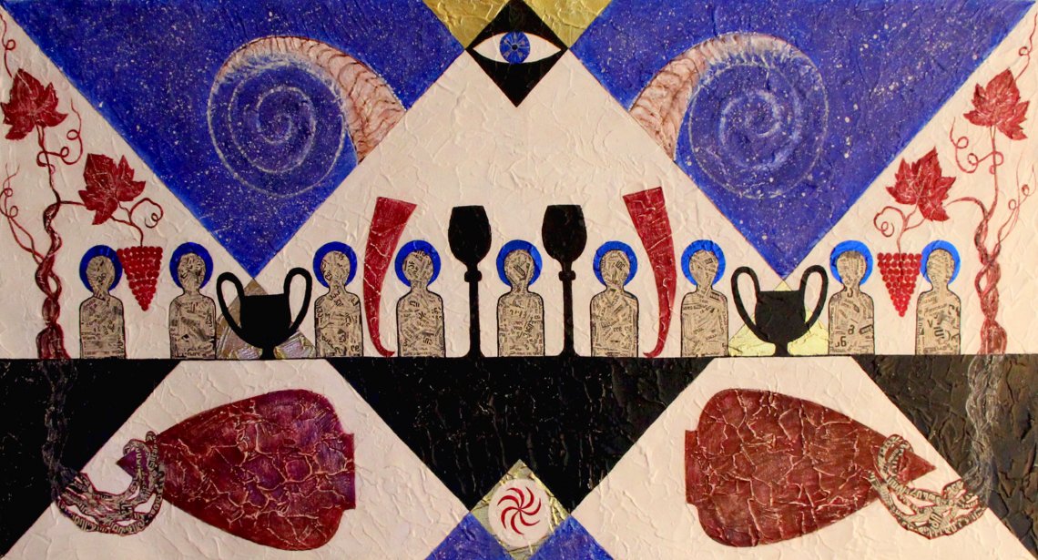 The painting Vinum Divinum is part of a series with the same name. The Georgian tradition of winemaking, with its unique methods of preparation, is based on thousands of years of history, when every drop of wine carried the soul of the earth and the precepts of the ancestors. Wine is not just a product, it is an element of cultural heritage that takes on a new meaning at traditional Georgian feasts - the so-called ‘Supra’. These feasts have deep ritual roots, reflecting the unity of people, where wine becomes a symbol of friendship, respect and communication. At this table I connected all eras and cultures, one common world table, with a symbol of both sacrifice and sacred meal, found in every culture mythology religion...