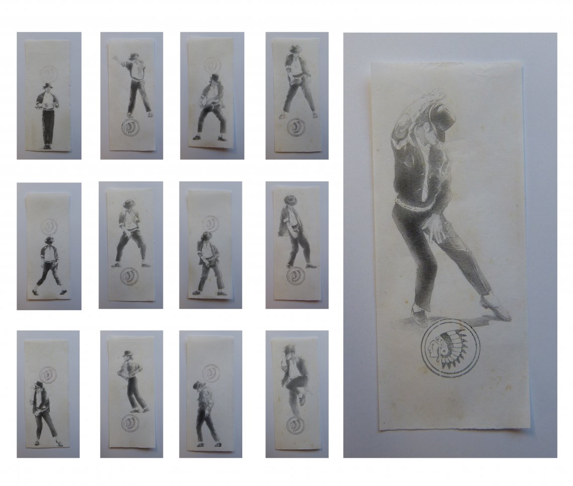 Me he inspirado en una escena de baile de Michael Jackson con el deseo de lograr representar sus gestos en cada movimiento y a su vez pretendo hacer de cada dibujo un retrato diferente, recreada en pequeños formatos con la intención de generar una sensación de fotogramas proyectándola a un futuro vídeo animado.
