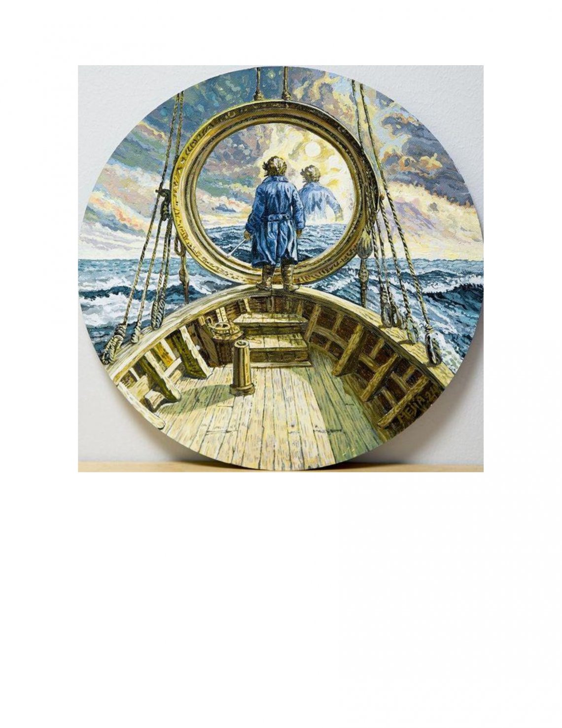 En esta obra se busca la contemplación de lo inefable, donde la figura humana se enfrenta no solo al entorno, sino también a sí misma. Pienso en ese hombre en la proa de un barco encarando su reflejo de espaldas, mientras se prepara para enfrentar la vastedad del mar: un símbolo claro de la introspección y la fragilidad humana ante el infinito. Esa imagen, cargada de un simbolismo casi existencialista, transforma el horizonte en un umbral hacia lo desconocido, donde el tiempo, la memoria y la eternidad convergen como uno solo.