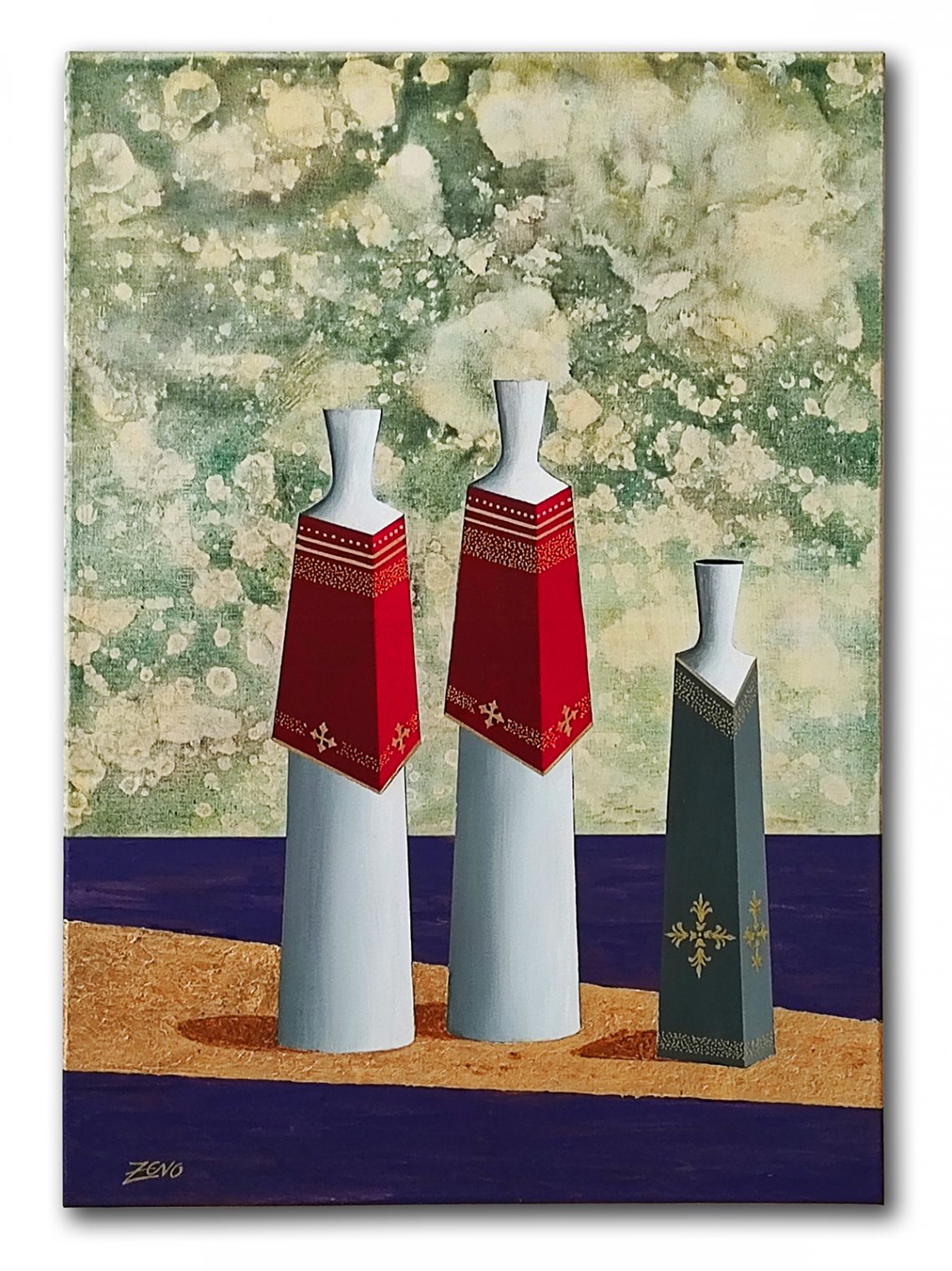 "La Processione" fa parte della serie "I Vasi di Zeno", ovvero la considerazione che l'artista ha dell'uomo. L'essere umano è visto come un contenitore, un vaso per l'appunto, vuoto alla nascita che durante la sua vita si riempie con tutte le esperienze che incontra. Premesso ciò, in questa opera c'è la visione dell'artista riguardo la religione in generale. Infatti questi ritiene che, più che dare risposte a quisiti sopranaturali, la religione è stata creata ad arte per governare, secondo interessi di pochi, la massa con la paura di una punizione divina. Tutto ciò è rappresentato dalle figure di tre personaggi che, ostentando una certa opulenza, avanzano su un tappeto dorato legittimando una autorità divina, dispensatrice di verità e capacità di protezione malgrado il cielo sopra di loro sia tutt'altro che rassicurante.
