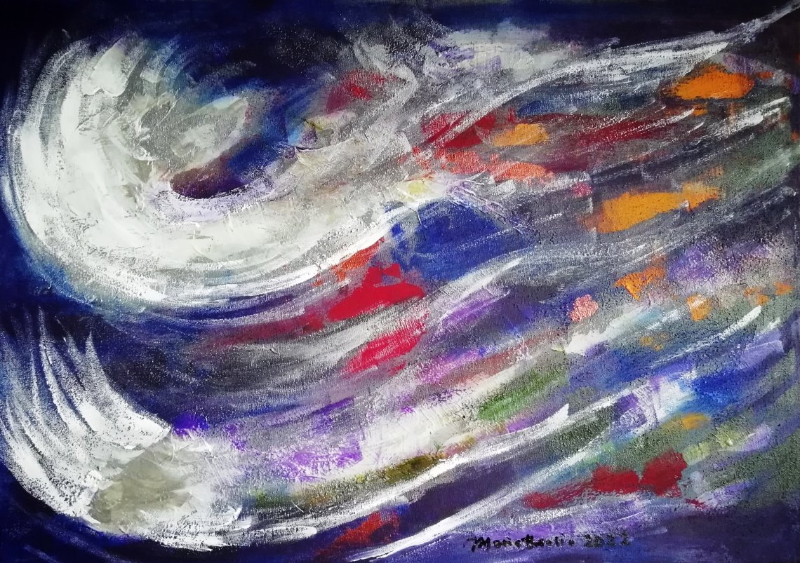 È fantastico quando qualcosa di meraviglioso si manifesta a noi favorevole: la pressione sale, l’euforia trabocca… Ci sembra di essere catapultati sul tetto del mondo. Le sfumature arancioni e verdi, che si mescolano al moto fluido della pennellata, aggiungono calore e vivacità alla scena suggerendo vitalità e gioia pura all’interno di questo tumulto.