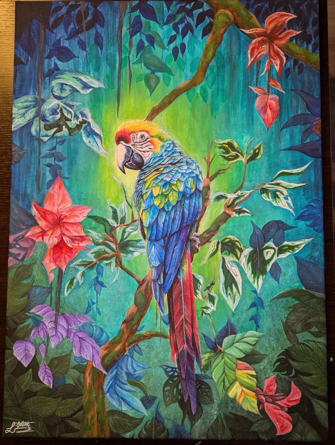 Im Mittelpunkt des Kunstwerks befindet sich ein lebendig gefärbter Papagei, dessen leuchtende Federn in Rot, Blau, Grün und Gelb eine atemberaubende Farbexplosion erzeugen. Der Vogel sitzt auf einem Ast, der umgeben von tropischen Blättern ist.