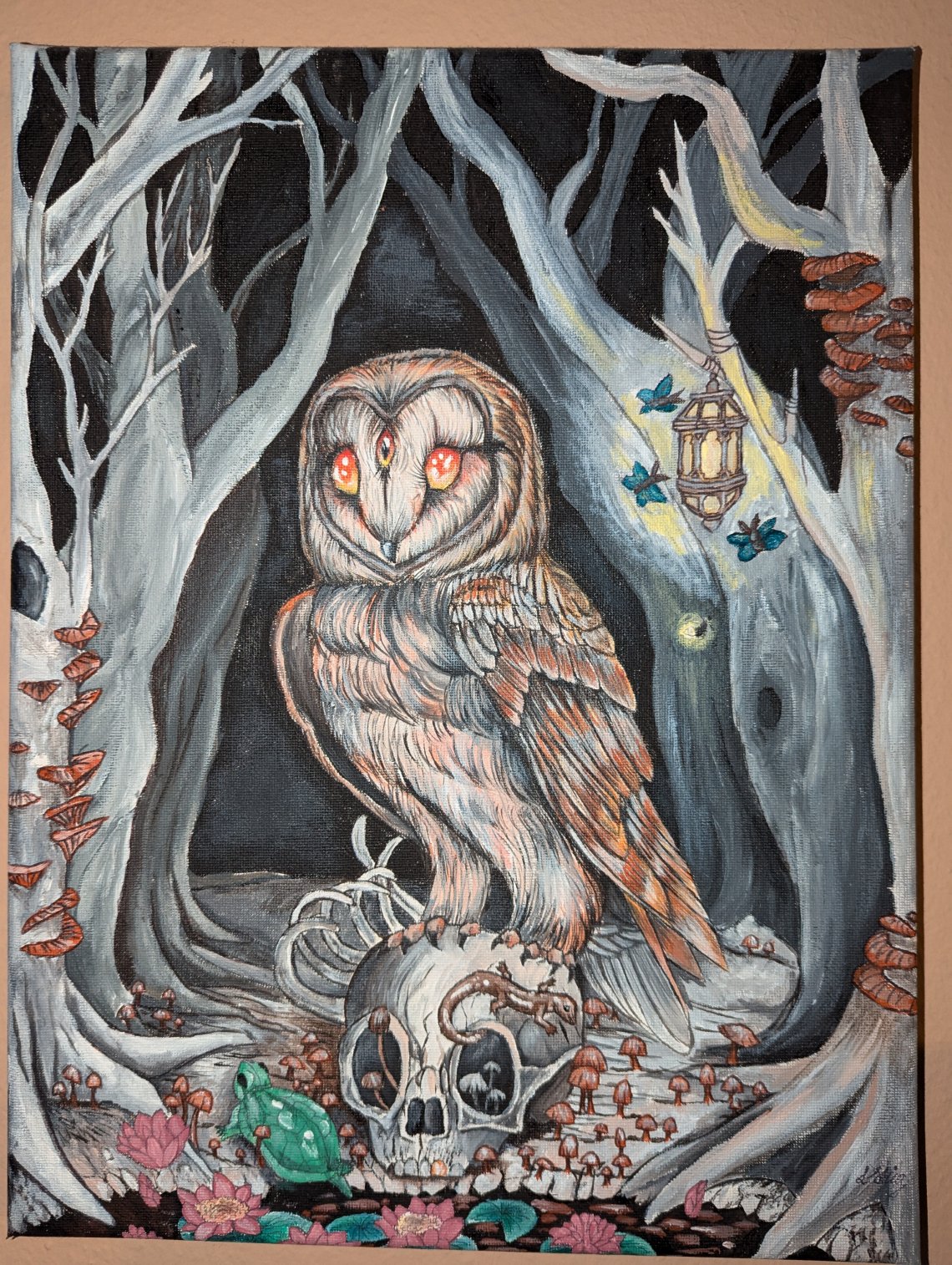 Das Werk zeigt eine geheimnisvolle Eule, die mitten in einem düsteren, aber zugleich bezaubernden Wald lebt. Ihr Blick ist scharf und aufmerksam, mit einem intensiven, leuchtenden Gelb & Orange in den Augen.